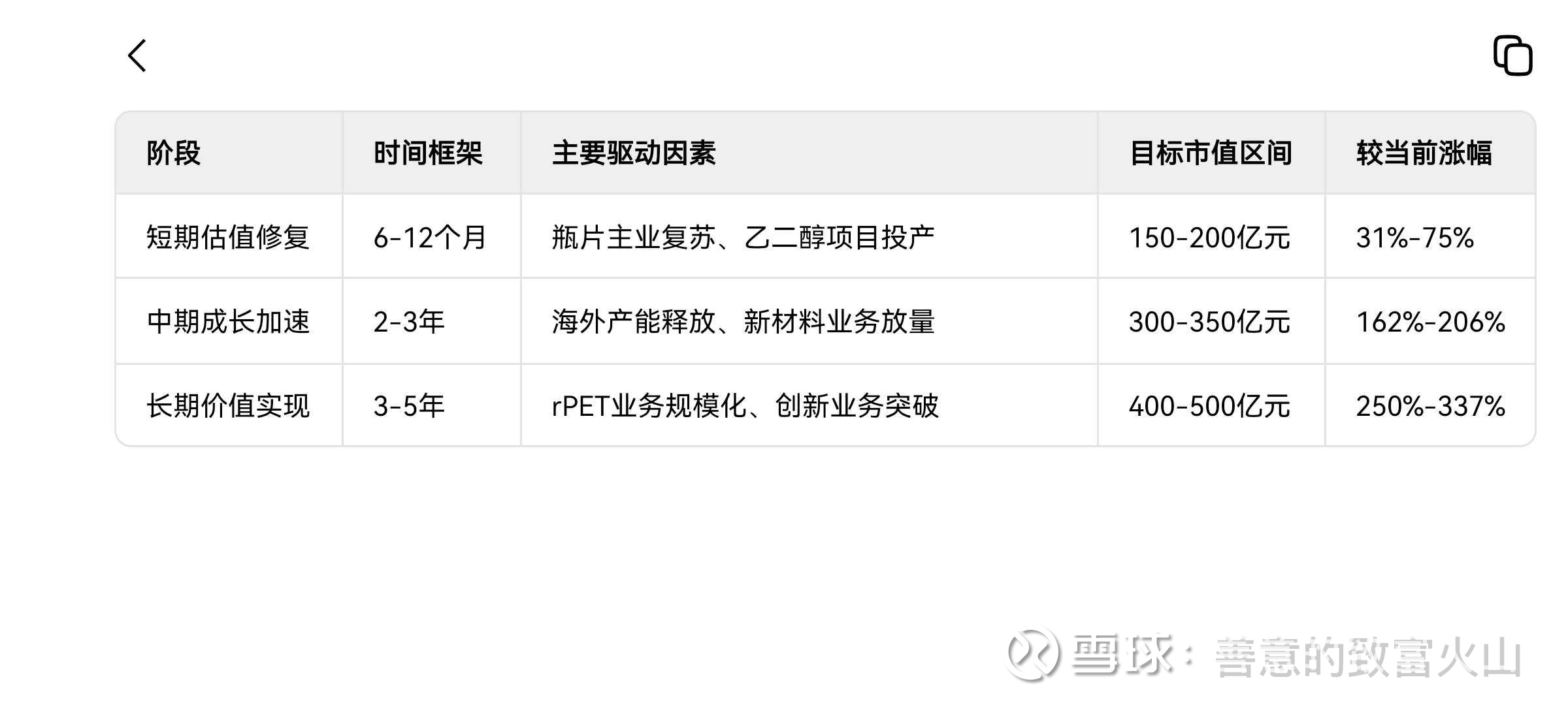 长期市值空间主要来自于rPET业务的爆发。公司远期规划将rPET产能扩张至百万吨级别,若按100万吨产能、单吨利润2000元测算,rPET业务可贡献20亿元净利润。考虑到其高技术壁垒与绿色溢价,给予20-25倍PE,对应市值400-500亿元。