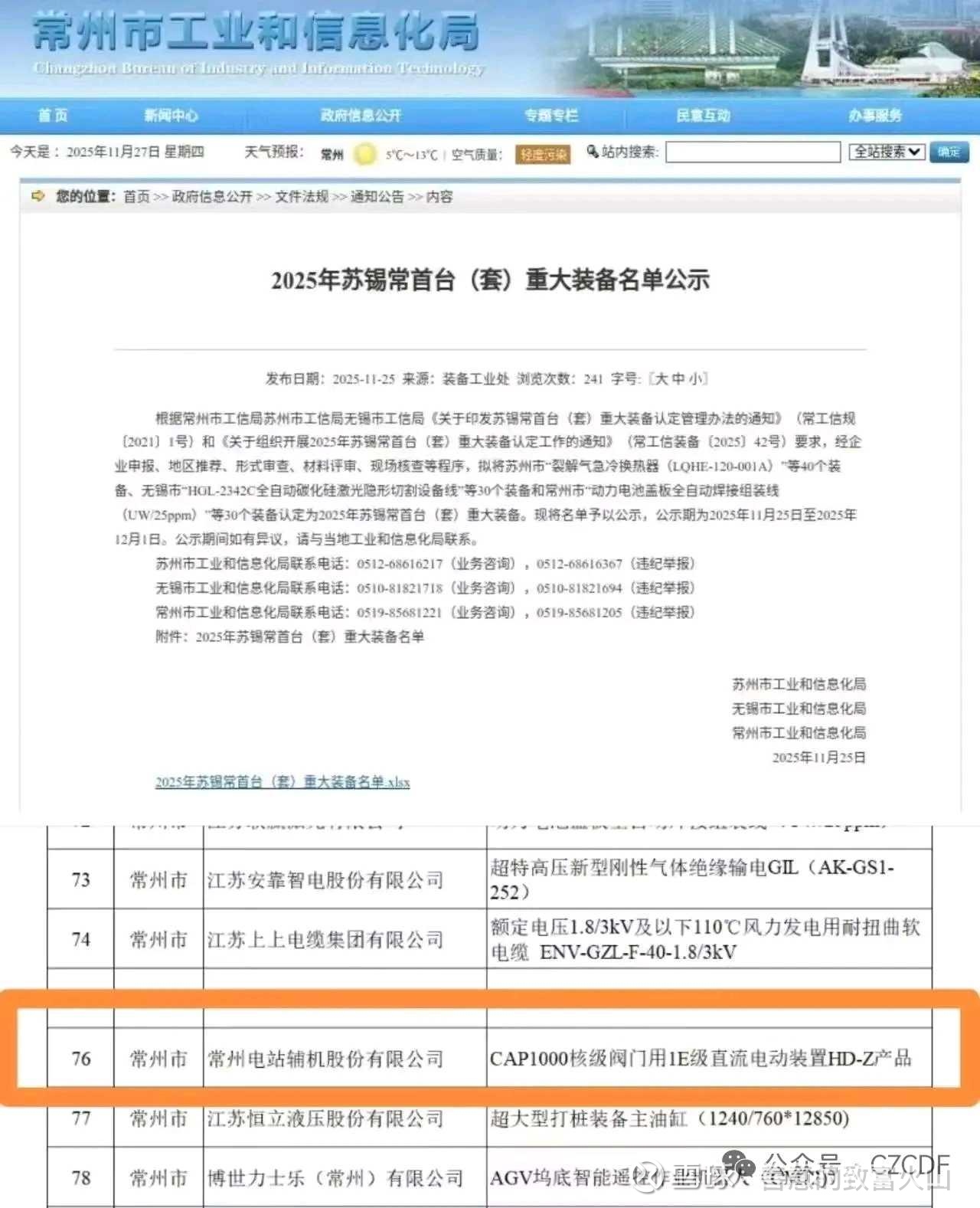 根据《关于印发苏锡常首台(套)重大装备认定管理办法的通知》,本次认定经过企业申报、地区推荐、形式审查、材料评审、现场核查等严格程序,确保认定工作的公正性和权威性。公示期:2025年11月25日至2025年12月1日(目前公示已结束)。本次公示共涉及100家企业的重大装备项目,常州地区仅30家,涵盖了核电装备、新能源、智能制造、轨道交通等多个战略性新兴产业领域,代表了苏锡常地区装备制造业的最高水平。