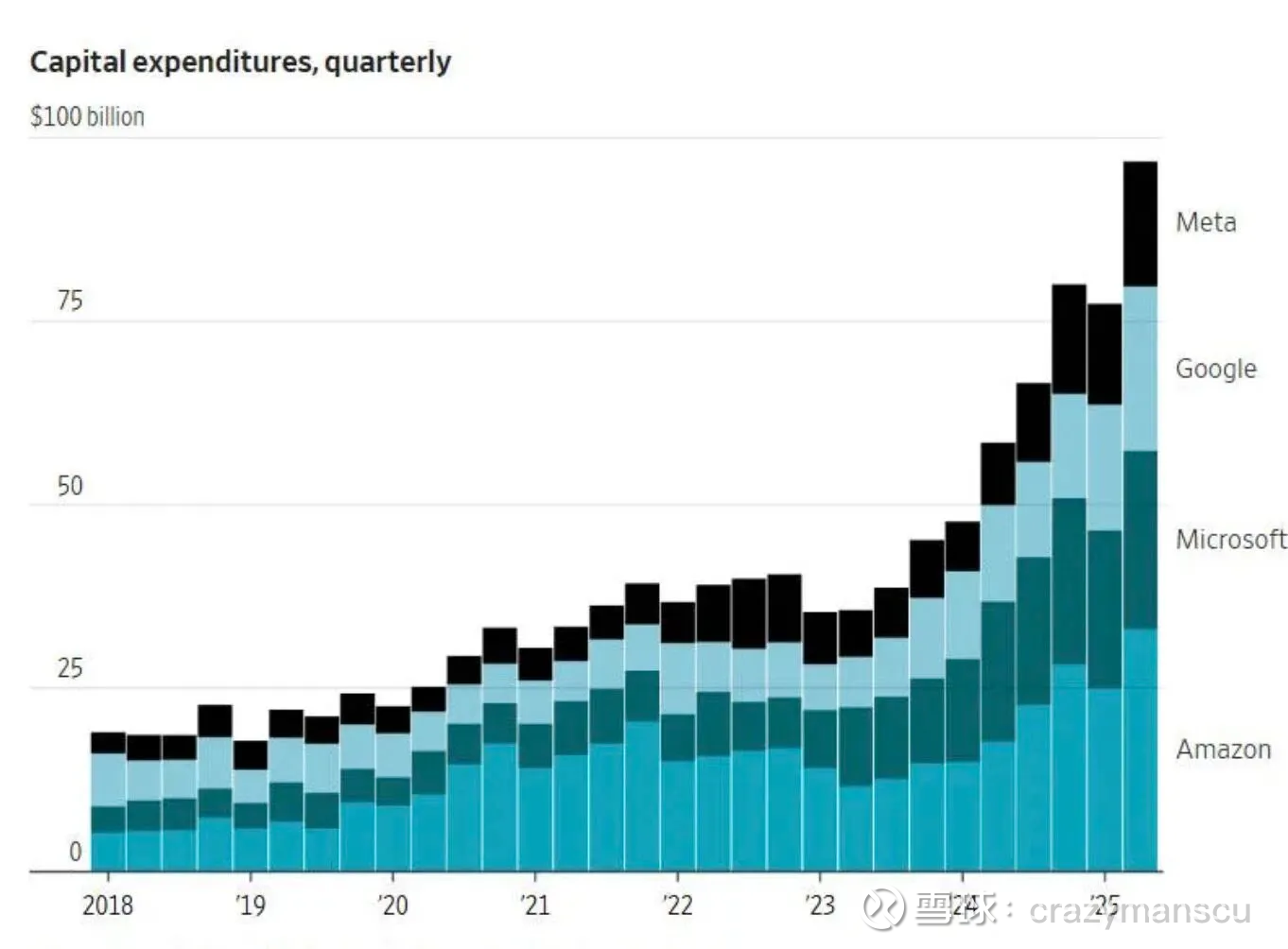 从下图可以看到,亚马逊、微软、谷歌和Meta四家巨头2023年以来资本支出都大增,现单季度加起来已接近千亿。