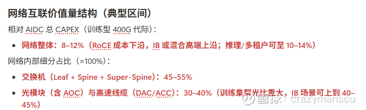 在AI数据中心中,交换机与光模块同属于网络互联部分,交换机的价值量比光模块还要大些。