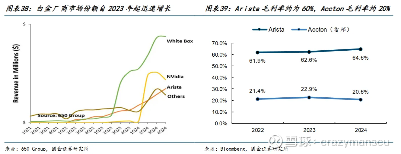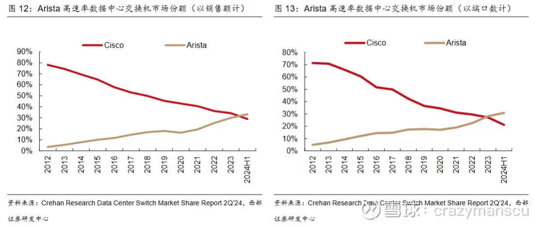 Arista是软硬件解耦的受益者,它最早推出开源的NOS系统,价格比黑盒低,兼容性强,在高速数据中心交换机中的份额已经超过思科。