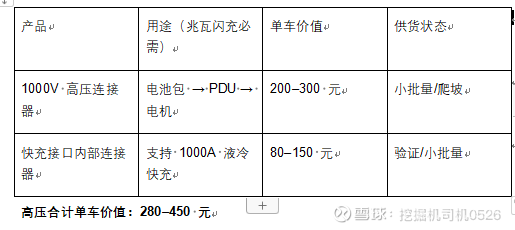 1.电连在一辆比亚迪 1000V 车上总价值:530–830 元/车