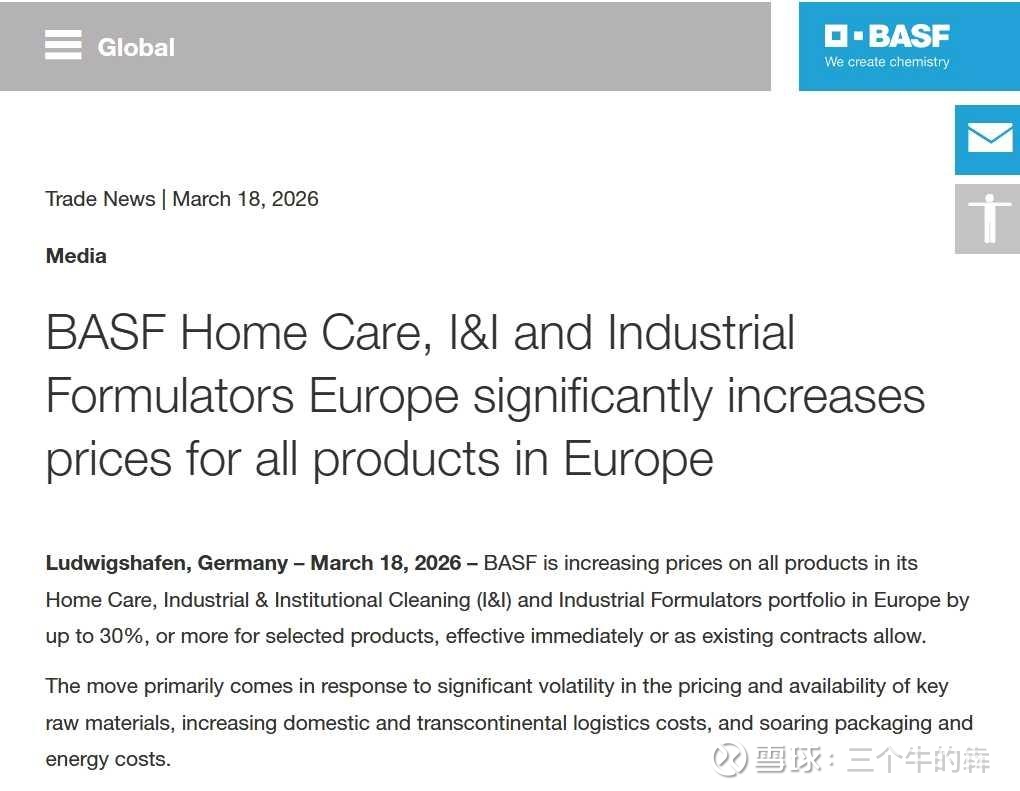 逻辑成倍增强在哪里?3月18日全球第一洗护化工巴斯夫宣布洗护化工产品涨价30%或以上,此时赞宇科技的洗护化工产业就需要价值重估了!石油基洗护化工的成本太高了,被部分替代将会是大趋势,赞宇的棕榈油基AES真的优势太大了!只要跟随涨价15%,利润就会有17亿,10倍pe都得170亿市值。