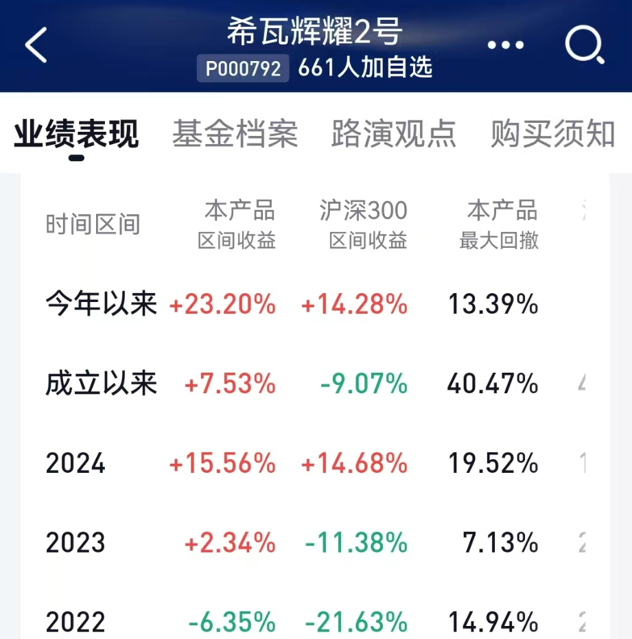 私募辉耀2在小将汤蒙中途退出后,由梁宏总接手,这2年确实大有起色,24年收益率15%,今年23%,都跑赢沪深300 10个点以上,但和我自己A,H的汇总收益率,24年38%,今年47%比都差了20个点以上,毕竟规模大了有很多限制。