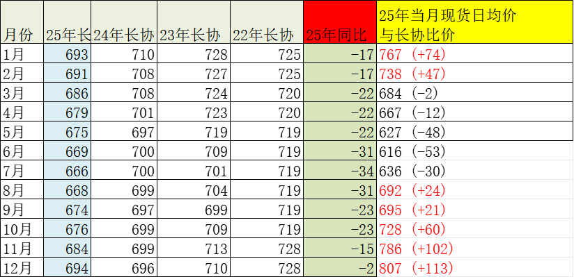 我整理了25年的月度长协煤价, 与当月现货日均价的对比, (见最后一列)