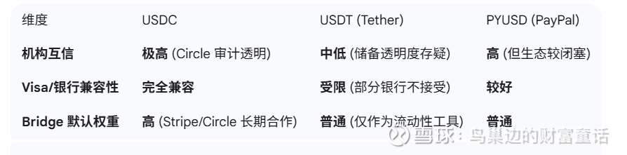 原生支持: Bridge 的基础设施几乎是为 USDC 量身定制的。Visa 选择 Bridge,等于间接选择了 USDC 作为其全球稳定币扩展的首选流动性资产。