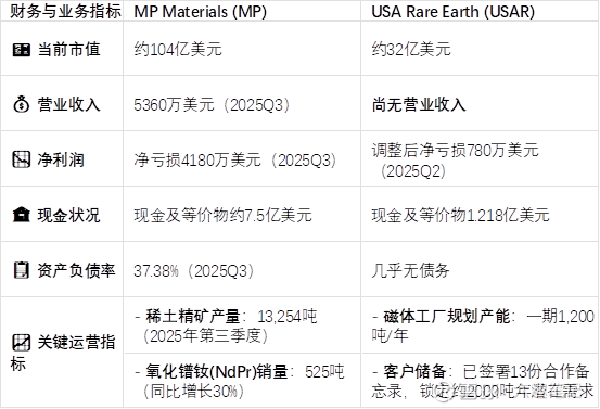 USAR的优势:稀缺重稀土资源禀赋。唯一能与中国南方离子矿抗衡的重稀土矿,目前在建Stillwater磁体厂(2026年上半年投产,年产2000吨高端钕铁硼磁体),形成“矿山-精炼-磁体”闭环,是全球除中国外唯一实现全链条闭合的企业。政府、政策、资金、国防订单这些方面的支持同MP,得到了美国政府16亿美元单笔最大稀土投资(10%股权+13亿美元债务融资),叠加15亿美元私募融资。