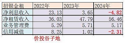 回到我前面的表2,因为招银金租在2024年增加了经营性租赁的占比,所以更多的收入被计入净租赁收入。利息收入不足以覆盖利息支出就产生了负数的净利息收入。我们在看报表的时候,应该将净利息收入和净租赁收入合在一起来看。两者之和2024年和2023年基本持平,但是都低于2022年。