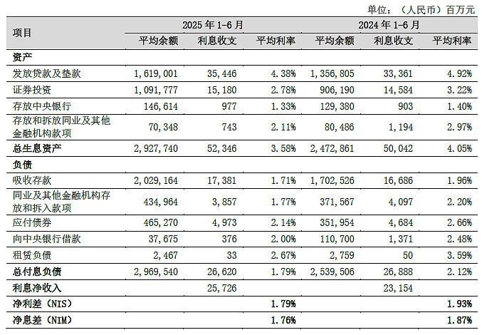 净利息收入的两位数增长得益于较高的资产增速和同比降幅不大的净息差。首先我们看一下中报披露的净息差同比明细表,如下图1所示: