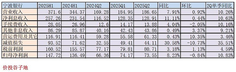 根据2025年中报,宁波银行营收371.6亿,同比增长7.91%。其中,净利息收入257.26亿同比增长11.11%。手续费收入28.05亿,同比上升4.04%。归母净利润147.72亿,同比增速8.23%。更多的数据参考如下表1: