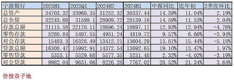 根据2025年中报,宁波银行总资产34703.32亿,同比增速14.39%。其中贷款16308.47亿,同比增19.1%。总负债32243.68亿比增14.59%。其中存款21115.58亿,同比增速12.93%。更多的数据参考表3: