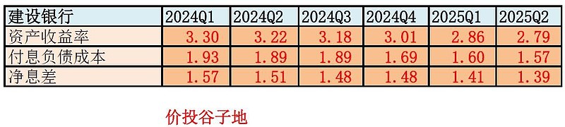 建行2025年中报披露净息差1.4%,净利差1.24%。我们利用净息差还原法,可以计算出建行二季报的资产收益率和负债成本,再和过去几个季度进行比较,如下表2所示: