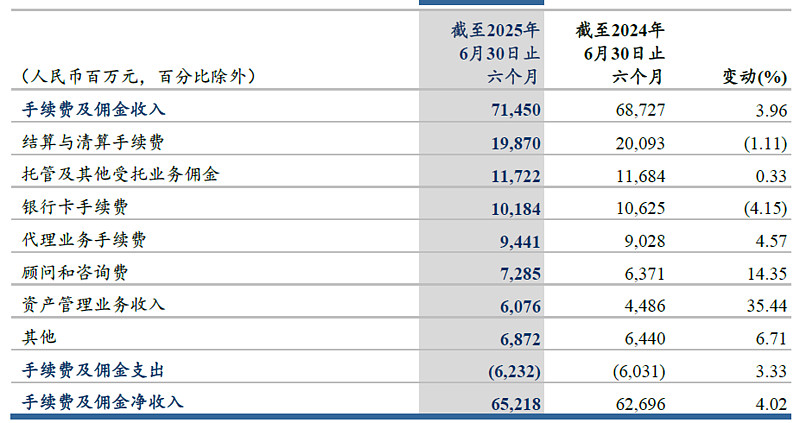 建设银行2025年上半年的手续费收入也扭转了最近两年受减费让利影响持续下滑的态势。第二季度单季手续费净收入同比增长18.53%。手续费收入明细如下图1所示: