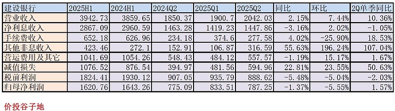 建行2025年中报的营收3942.73亿,同比去年增长2.15%。其中,净利息收入2867.09亿,同比降3.16%。手续费收入652.18亿,同比增长4.02%。其它非息收入423.46亿,同比大幅增长55.63%。归母净利润1620.76亿,同比降1.37%。更多的数据参考表1: