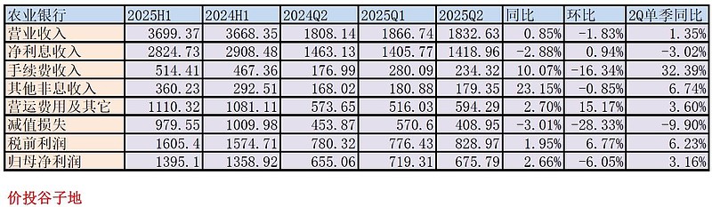 根据2025年中报,农业银行营业收入3699.37亿,同比去年同期增长0.85%。农行净利息收入2824.73亿,同比去年下降2.88%。非利息收入中,手续费和佣金收入514.41亿,比去年同期增长10.07%。归属股东净利润1395.1亿,同比去年增长2.66%。更多细节的数据和环比数据参考表1: