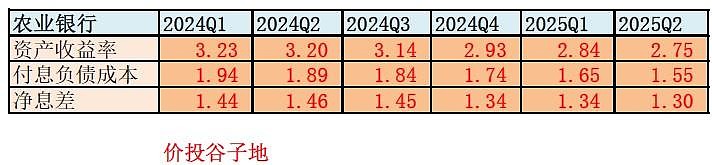 从表2中可以看到农业银行2025年第二季度单季的净息差为1.3%,环比下行了4bps。这个环比下行幅度小于其他大行。