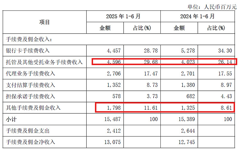 根据2025年中报,营业收入1104.58亿,同比下降2.29%。其中,净利息收737.55亿,同比下降1.52%。非息收入中手续费收入130.75亿,同比增长2.59%。归母净利润431.41亿,同比上升0.21%。更多的数据参考如下表1: