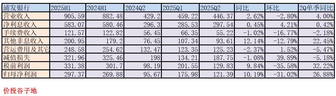 根据2025年中报,浦发银行营收905.59亿,同比增长2.62%。净利息收入583.07亿,同比上升0.45%。非利息收入中手续费收入121.57亿同比下降1.02%。归母净利润297.37亿同比增长10.19%。更多的数据如下表1所示: