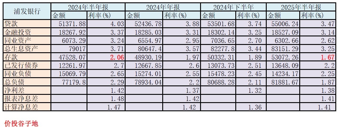 中报净利息收入同比保持了正增长,环比出现了4.21%的增长。考虑到浦发银行年内的资产扩张较弱。这说明浦发银行的净息差在第二季度出现了明显改善。我们先来看一下半年报和去年下半年净息差各项明细之间的对比,我利用2024年年报,2024年半年报可以估算出2024年下半年的数据,如下表2所示: