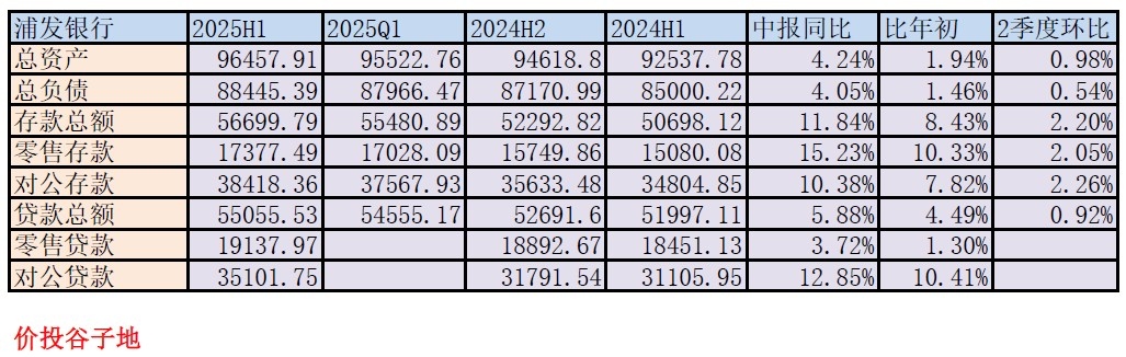 根据2025年中报,浦发银行总资产96457.91亿,同比增4.24%。其中贷款总额55055.53亿同比增长5.88%。总负债88445.39亿,同比增速4.05%。其中,存款56699.79亿,同比增11.84%。更多的数据参考表4: