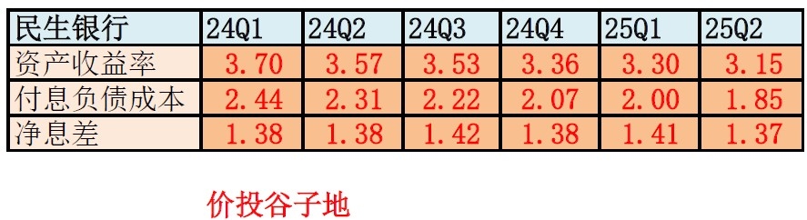 从表2可以看到民生银行第二季度净息差环比下降了4bps。民生银行的负债成本环比下滑15bps,资产收益率也是环比下滑15bps。最近6个季度,民生银行的净息差稳定在1.37%到1.42%的范围内。其中,资产收益率从2024年1季度的3.7%下降到3.15%,降幅55bps,负债成本从2.44%下降到1.85%,降幅59bps。由此可见,负债成本大幅下降确保了民生银行的净息差保持了基本稳定。