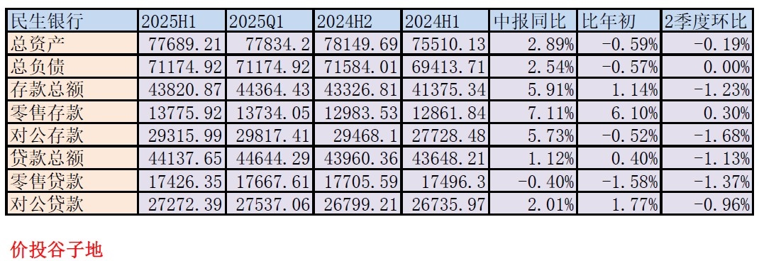 根据2025年中报,民生银行的总资产77689.21亿,同比增长2.89%,比年初下降0.59%。贷款44137.65亿,同比增长1.12%。总负债71174.92亿,同比增长2.54%,比年初下降0.57%,其中存款43820.87亿同比增长5.91%。更多的数据参考表3: