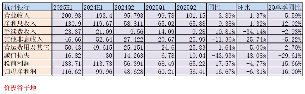 根据2025年中报,杭州银行总营收200.93亿同比增长3.89%,其中净利息收入130.9亿同比上升9.38%,手续费收入23.37亿同比增长10.81%,净利润116.62亿同比增长16.67%,更多数据参考如下表1所示:
