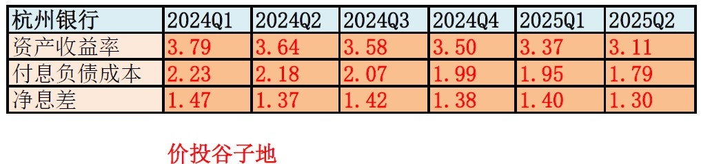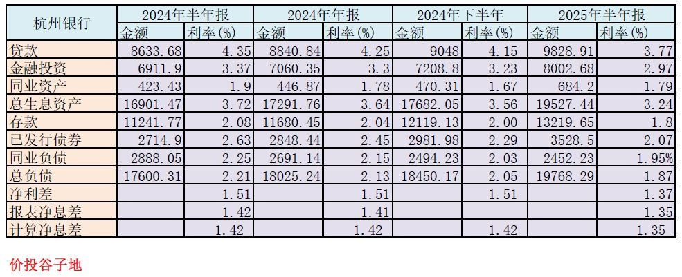 从表3中我们看到杭州银行2025年上半年的净息差1.35%比去年同期下降了7bps。其中,资产收益率从3.72%下降到3.24%,同比下降48bps;负债成本从2.21%下降到1.87%,同比下降了44bps。