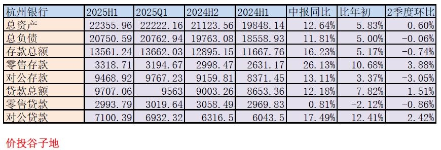 根据2025年中报,杭州银行总资产22355.96亿同比增长12.64%,其中贷款9707.06亿同比增长12.64%。总负债20750.59亿同比增长11.81%,其中存款同比增长16.23%,更多的数据参考表4: