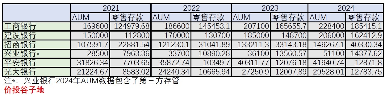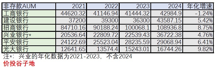 看表1的时候我们要注意一点,就是兴业银行2024年的AUM数据口径和前面是不一致的,包含了第三方存管(股票、期货等投资账户)的数据。从表1我们可以看到,国有大行和招行基本是同一档,AUM超过100,000亿。其他股份制银行AUM普遍在2~4万亿。国有大行和股份制银行的AUM组成有较大的区别:国有大行的AUM以个人存款为主,股份制银行的AUM以非存款AUM为主。如果我们单看非存款AUM,数据如下表2所示: