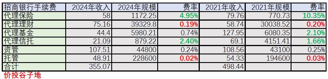 如果说对于规模发展算是差强人意,那么费率的变化就更难看了。和2021年相比,2024年招行的4项代理费率中只有代理信托的费率有所上升。这里面的信托费率上升更多是业务结构的调整。2021年信托业务主要是将房地产相关的高收益产品包装成类固收理财
