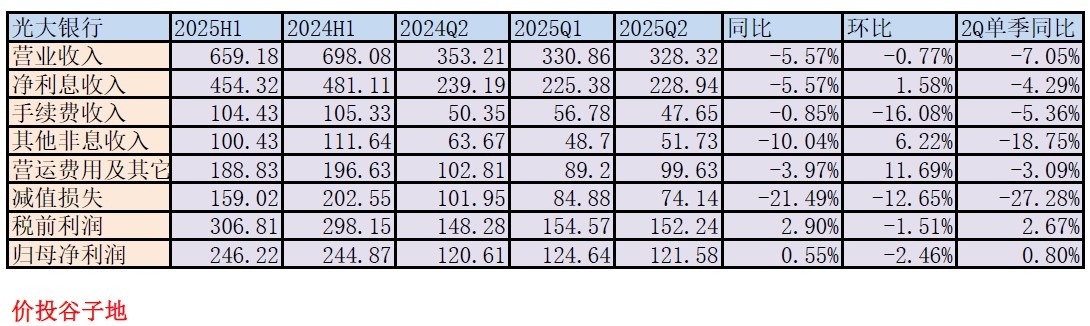 根据光大银行2025年中报,总营收659.18亿同比下滑5.57%。其中,净利息收入454.32亿,同比显著下滑5.57%。非息收入中的手续费收入104.43亿同比下滑0.85%。最终中报的归母净利润246.22亿,同比增速0.55%,更多的数据见表1: