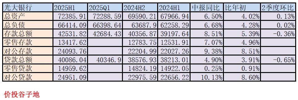 光大银行2025年中报显示,光大银行总资产72385.91亿,同比增长6.5%。其中贷款总额40086.04亿,同比增长4.9%。总负债66414.09亿同比增长6.68%。其中存款总额42531.82亿,同比下滑8.51%。更多的数据请参考表4: