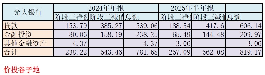 从表5我们可以看到光大银行2025年中报对于不良的认定标准有了明显的放松。2024年年报光大银行阶段三的贷款总资产为539.06亿,不良余额为492.52亿,阶段三贷款不良认定率=492.52/539.06=91%。2025年中报光大银行阶段三的贷款总资产为606.14亿,不良余额为509.15亿,阶段三贷款不良认定率=509.15/606.14=84%。