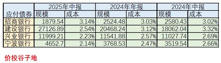 从表1我们可以看到,2025年中报4家样本银行的应付债券成本从高到低排序依次是:招商银行3.14%、建设银行2.54%、兴业银行2.23%、宁波银行2.14%。而且,我们看到4家银行中,只有招行的应付债券成本在逐渐走高,从2024年中报的3.02%,到2024年年报的3.03%,再到2025年中报的3.14%。