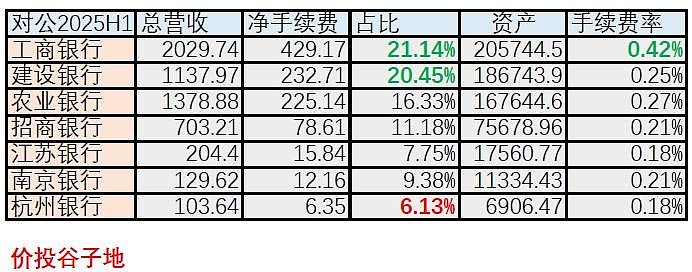 手续费贡献率表现最好的是工行,0.42%的数值远超同业。农行和建行分列第二和第三。剩下的4家银行贡献率都相差不大,基本围绕0.2%。工行手续费贡献率远超同业,个人理解是因为工行几十年深耕对公业务,其提供的相关服务更多,业务更复杂。
