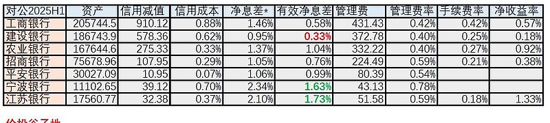 我们在表5净息差的基础之上,扣除信用成本后就得到了有效净息差。7家银行的有效净息差最高的两家都是城商行,都超过了1.5%。最低的是建设银行有效净息差只有0.33%。剩下4家在0.5%-1%。