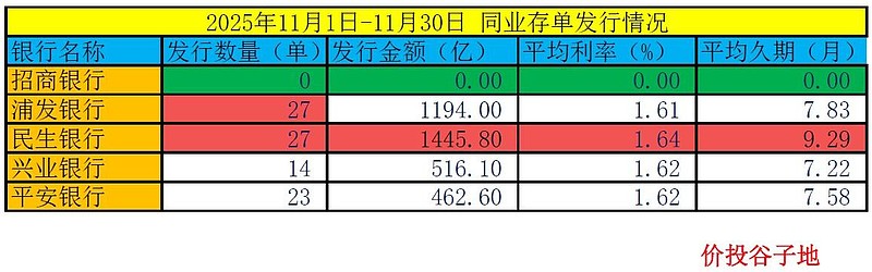 11月份,5家银行新发的加权同业存单利率1.62%比10月份的1.63%减少了1bp。发行成本最高的是民生银行1.64%,除招行外加权发行成本的最低的是浦发银行1.61%。更多的数据请参考如下图4: