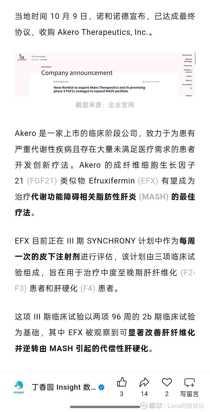 $华东医药(SZ000963)$ 又一款FGF21靶点相关的大额并购,诺和诺德52亿美元收购Akero Therapeutics,拿下目前处于三期的FGF21药物Efruxifermin。10624你的bd还有机会吗,那么好的数据