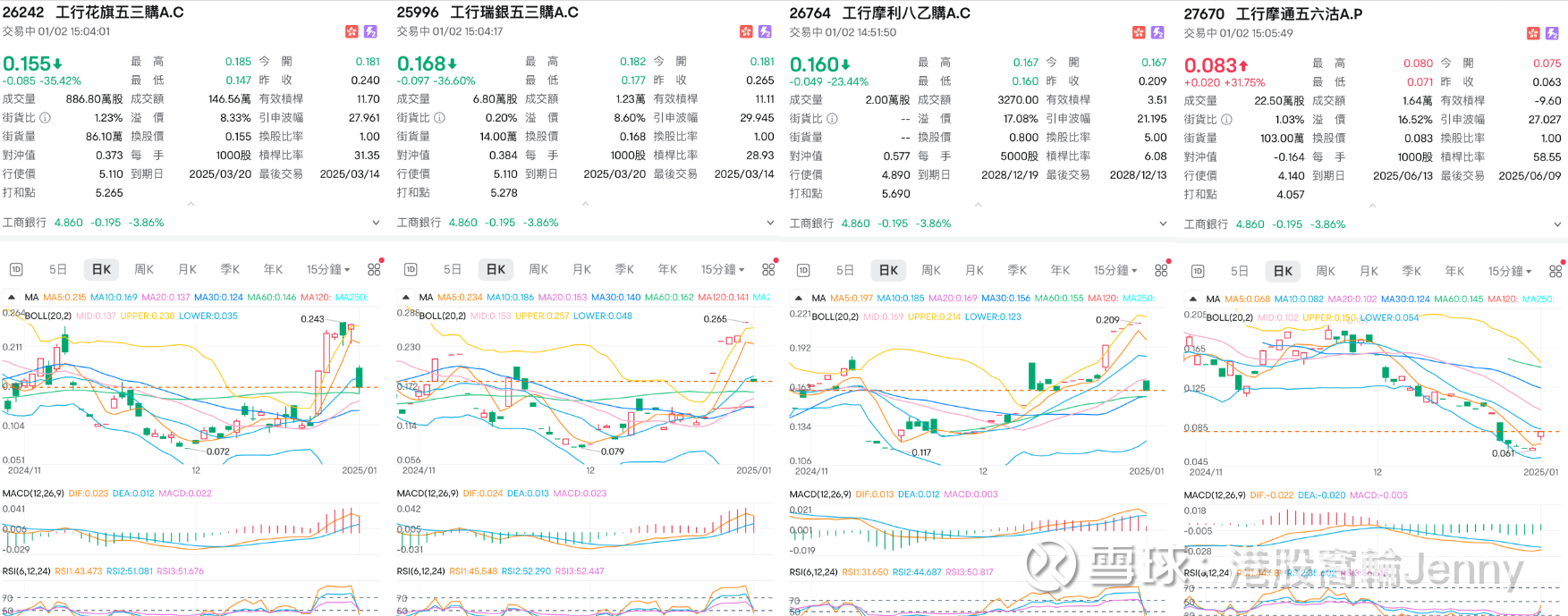 投資者認為這個消息一出估計工行短期見頂,亦有投資者表示等4.5附近再考慮買入,如認為工行短線有望反彈,可留意行使價5.11的認購證,如花旗購$工行花旗五三购A(26242)$ 或瑞銀購25996,槓桿11.7及11.11倍,2025年3月20日到期。長期且相對貼價的認購證有摩利購26764,行使價4.89,槓桿3.51倍,2028年12月到期;如繼續看淡工行,可留意摩通沽$工行摩通五六沽A(27670)$ ,行使價4.14,槓桿9.6倍,2025年6月13日到期。