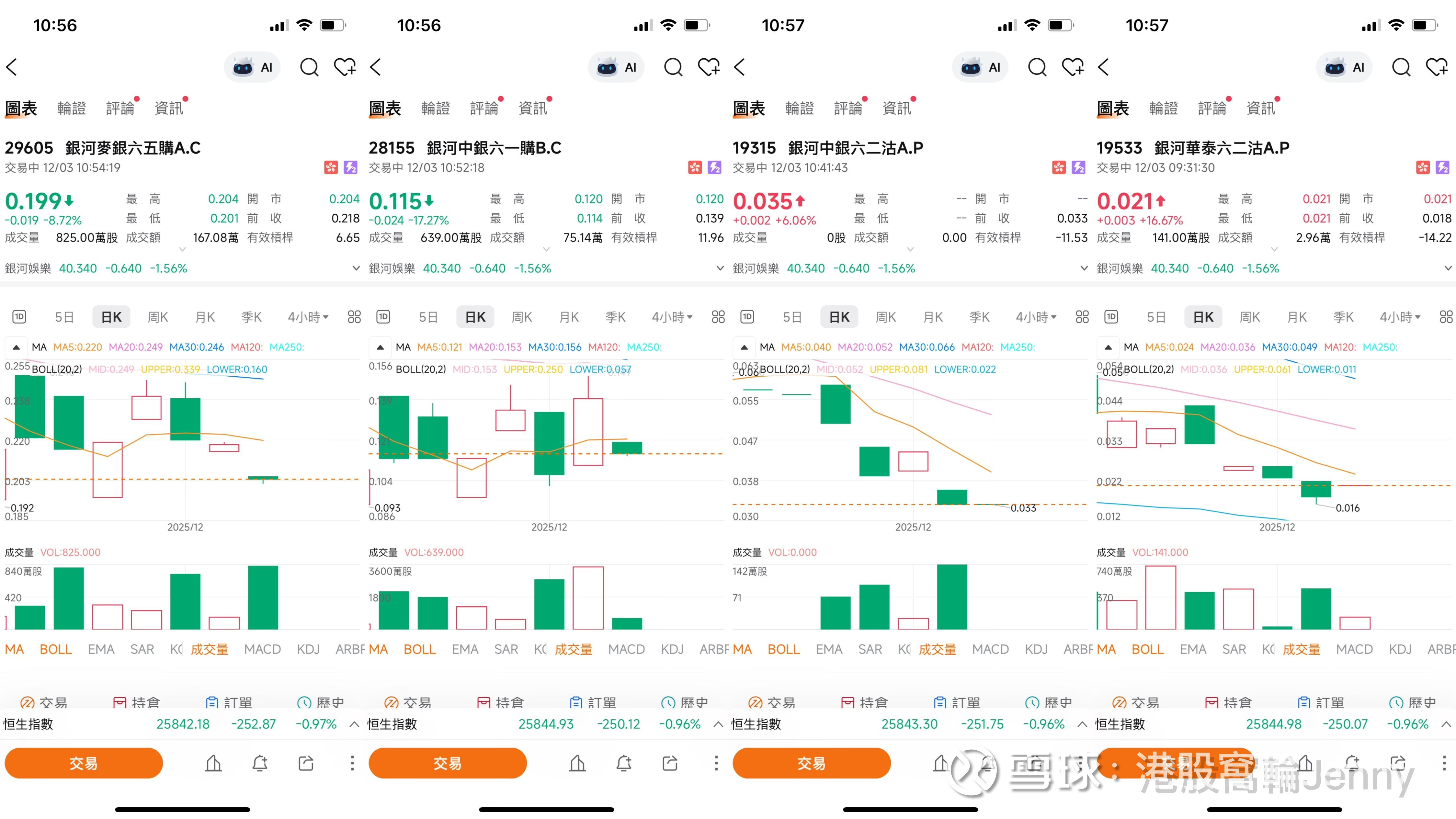 衍生工具市場為不同預期的投資者提供了多樣化的選擇。回顧近期表現,當銀娛正股在11月26日錄得約2.71%的漲幅後,相關認購證表現出明顯的槓桿效應,瑞銀認購證(13181)及中銀認購證(28155)在隨後兩日分別上升16%及19%。這再次印證,在正股出現明確方向時,衍生工具的價格波動往往更為顯著。