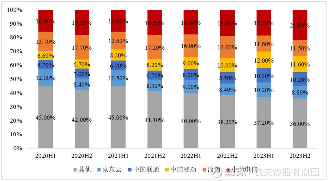 专属云领域,主要市场参与者包括中国电信、中国移动和中国联通在内的运营商供应商,以京东云为代表的互联网厂商,以及以浪潮信息、中科曙光、深桑达为代表的IT厂商,专属云市场份额情况如下: