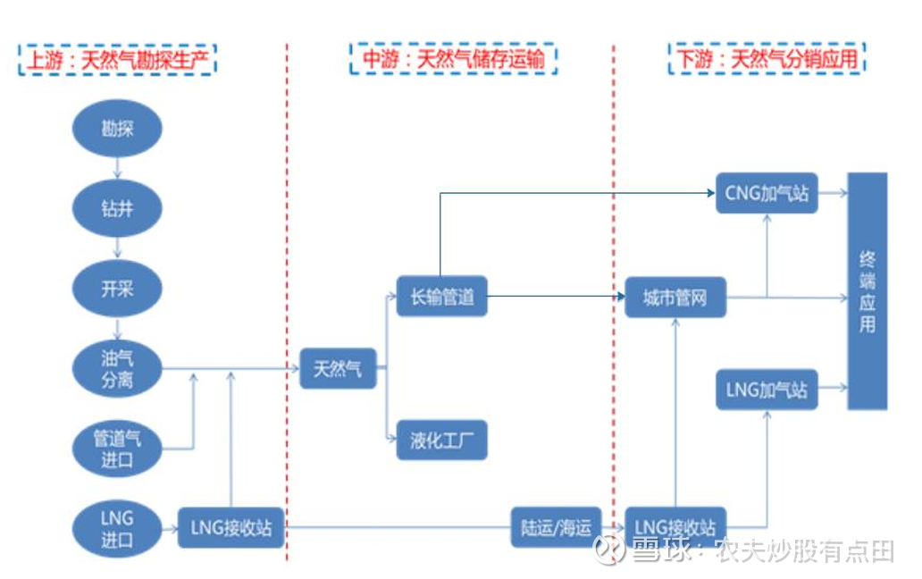 天然气生产过程一般分为三个环节:上游生产、中游输送及下游分销。上游生产主要包括天然气开采和净化,某些情况下,会进一步压缩或液化;中游输送指将天然气由净化厂通过长输管道输往下游分销商指定输送点;下游分销涉及向终端用户提供天然气。上游企业为油气生产企业,主要是中石油、中石化、中海油三家企业,天然气管道输送企业处于天然气行业的中游,下游企业主要为城市燃气公司及工业用户。