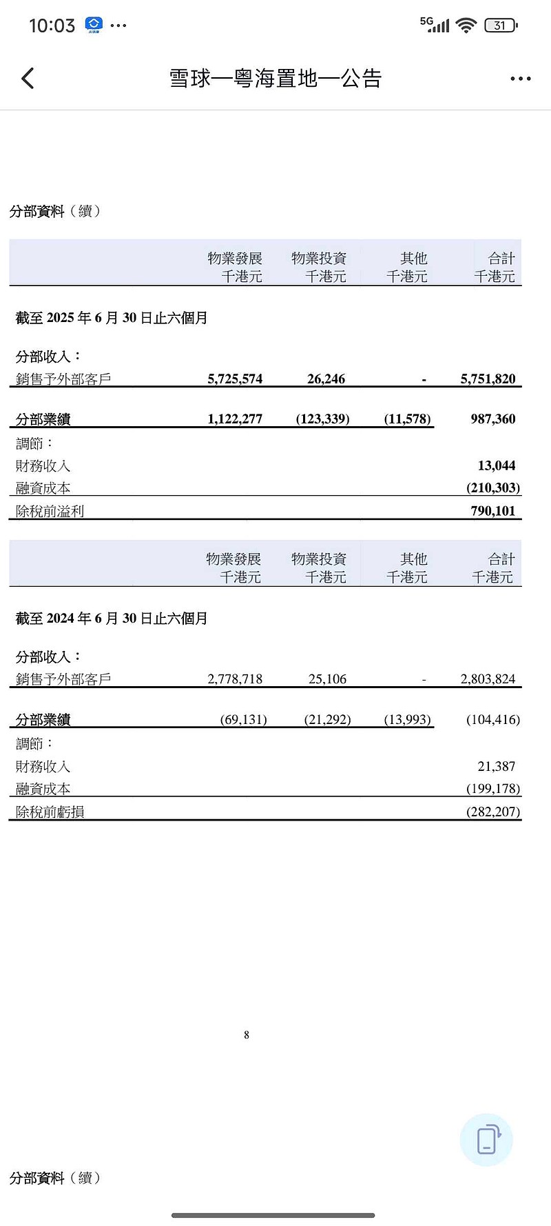 开发物业的业绩超预期,投资物业的业绩低于预期(90多亿的投资物业半年收益约为百分之0.28)