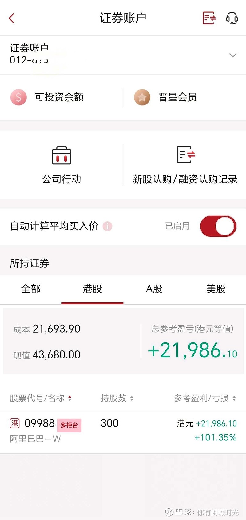 $阿里巴巴-W(09988)$ 我一直以为香港银行账户买股票没有管理费呢,做为长期价值投资者很少打开去看,近日打开一看,港卡里的零钱消失了,查看结单才发现,中银香港每半年收一次服务半年保管费,半年150港币,一年就是300港币,把我心痛的,我当时就想试下在银行交易股票,大陆这边银行卡是没有这个功能的,因为银行和券商是分业经营,早知道银行交易港股收保管费,我就把钱转到券商账户去买股票。我在App客服查询了一下,凡在银行账户买卖过股票,就收取半年保管费。香港的银行普遍都收保管费,很多人说香港开卡不收管理费,他们说的是银行账户,同时开了证券交易账户如果交易就会有保管费,如果不交易可能会冻结股票账户。$中银香港(02388)$