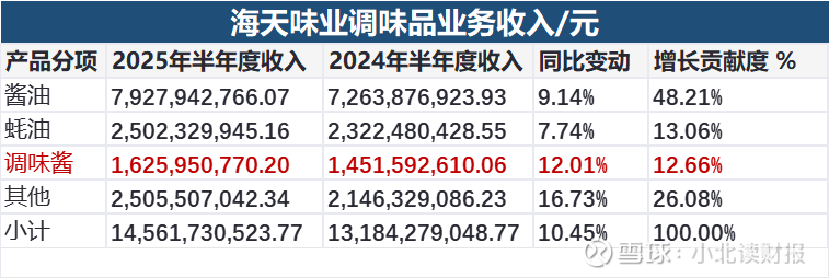 如上表所示:今年上半年海天调味品业务收入同比增长10.45%,其中食醋、调味料等其他品类的收入同比增长16.73,且其他品类的收入达到了25.05亿元,超过了海天蚝油和调味酱这两项原有支柱业务的收入。
