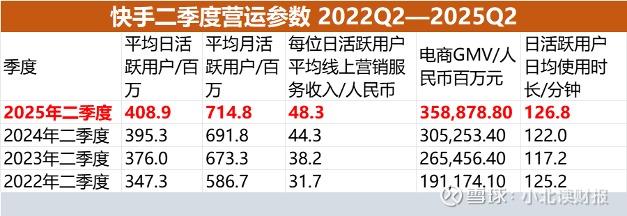 2025年第二季度,快手日活用户日均使用时长达126.8分钟,同比增长7.5%;用户规模同比增长,用户使用时长同比增长,为在线营销、电商和直播业务的开展,打下了良好的用户基础。