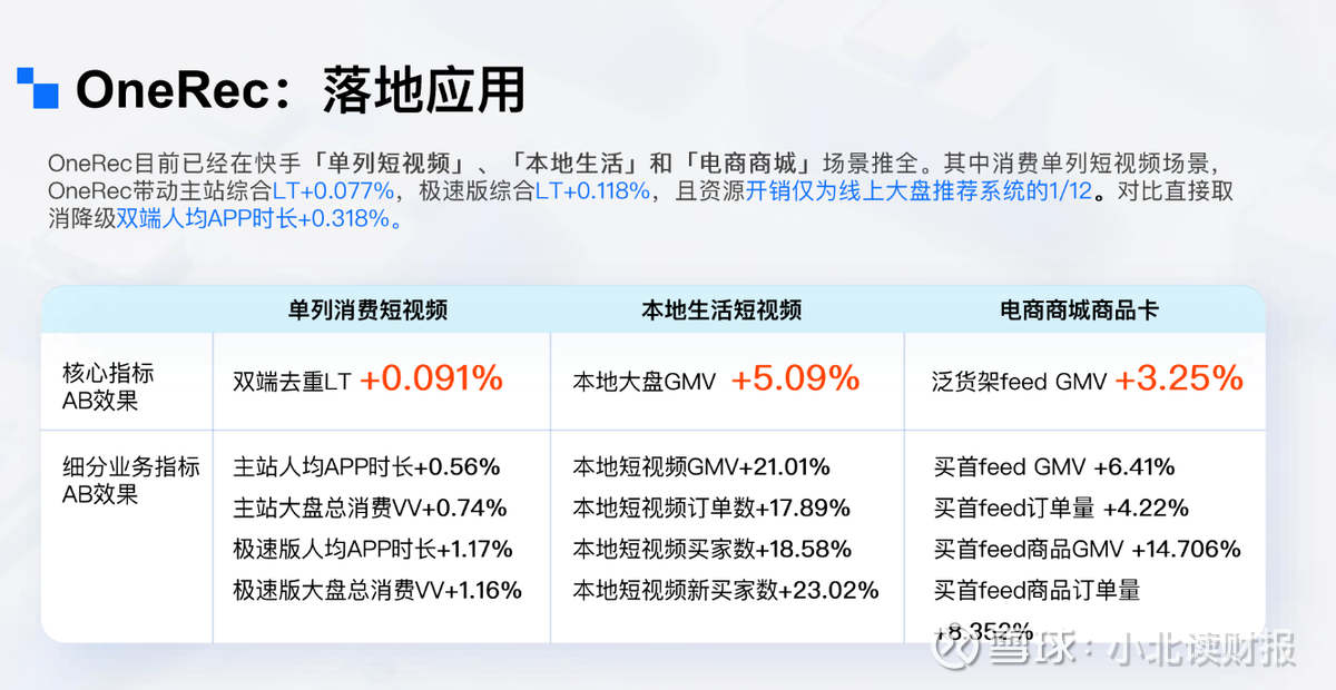 从网上的其他资料看,OneRec已经应用到了快手的单列短视频、本地生活和电商商场,并取得了可以量化的效果。
