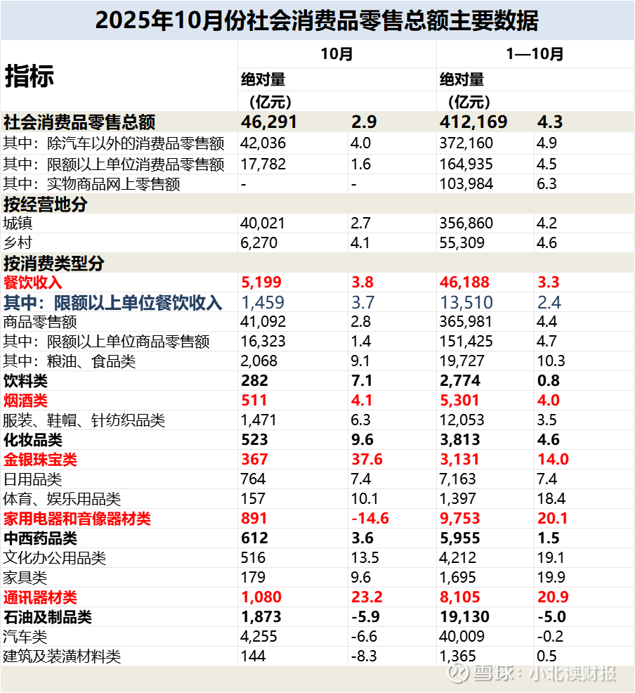 终于到了10月份,受节日消费拉动以及双十一提前启动等因素的刺激,规模以上餐饮收入恢复增长,烟酒类零售额增速达到了4.1%,当然这跟去年十月份负增长也有关系,但这至少表明某些政策修复的效果已经得到呈现。
