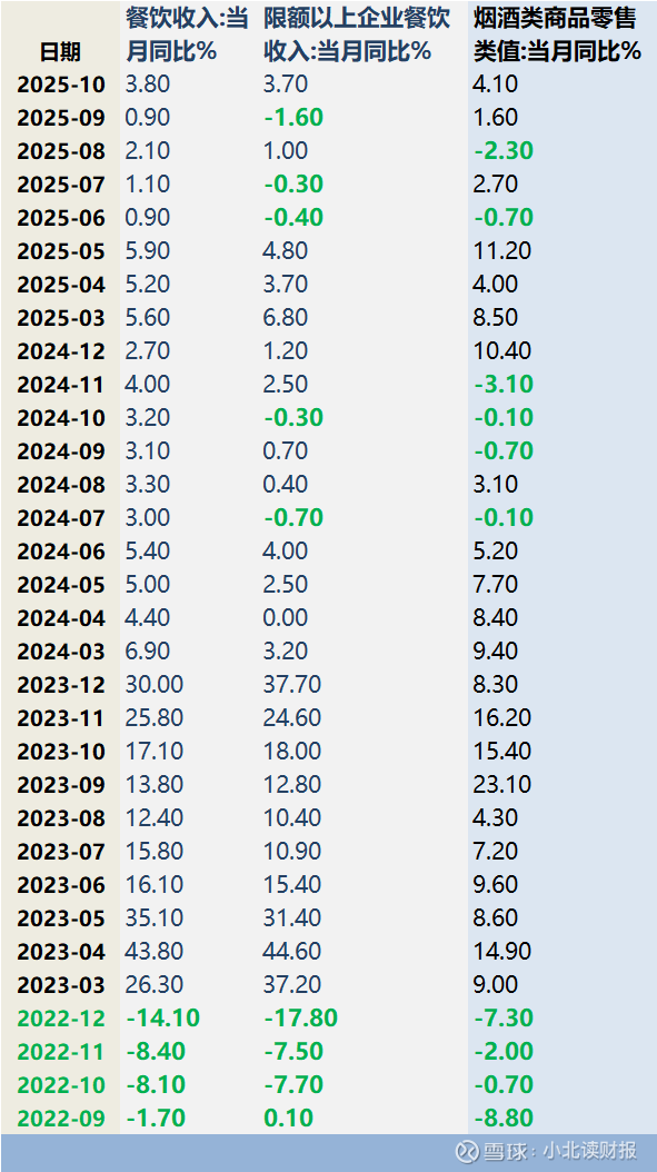 2023年,在2022年低基数、负增长的基础上,餐饮收入和烟酒类零售额增速较快;到了2025年,由于需求疲软叠加政策变动等因素,今年6、7、9月份,限额以上餐饮收入出现了负增长。